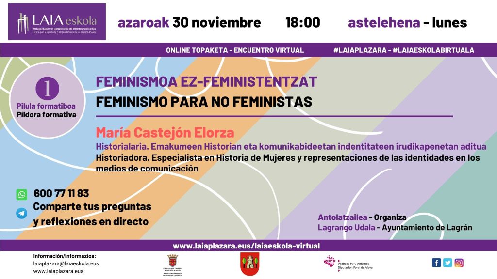 Formadora: María Castejón Elorza, historiadora. Especialista en Historia de Mujeres y en representaciones de las identidades en los medios de comunicación.