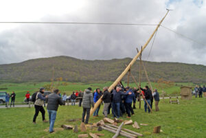 En la Era del Mayo, la  maniobra ha sido en cierto modo sencilla, a tenor de una altura moderada (se recuerda haberse traído Mayos de 30 metros). «Con más gente para amarrar más sogas merecería la pena tirar un haya más alta, pero bueno está recta, bonita y esperemos que dure lo más posible sin curvarse la punta hasta el 14 de septiembre». Es la fecha final de un ciclo que ha comenzado hoy al emocionante grito de aliento comunitario «Arriba el Mayo».