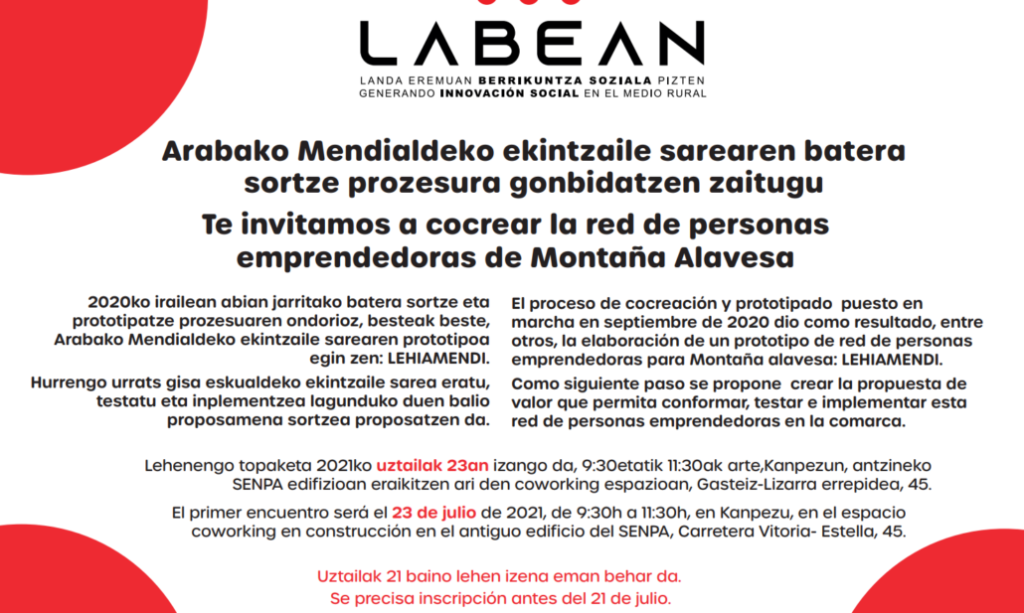 Jornada de cocreación de la Red de personas emprendedoras de Montaña Alavesa Publicado por Mendialdea.Info | | Actualidad, Campezo / Kanpezu, General, Montaña Alavesa, Municipios INSCRIPCIONES Para más información pincha aquí