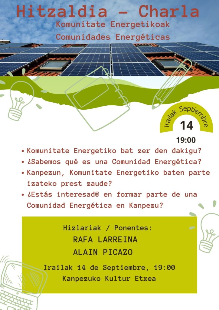 Charla-Hitzaldia: Comunidades energéticas (Kanpezuko Kultur Etxea, irailak 14 de septiembre)
