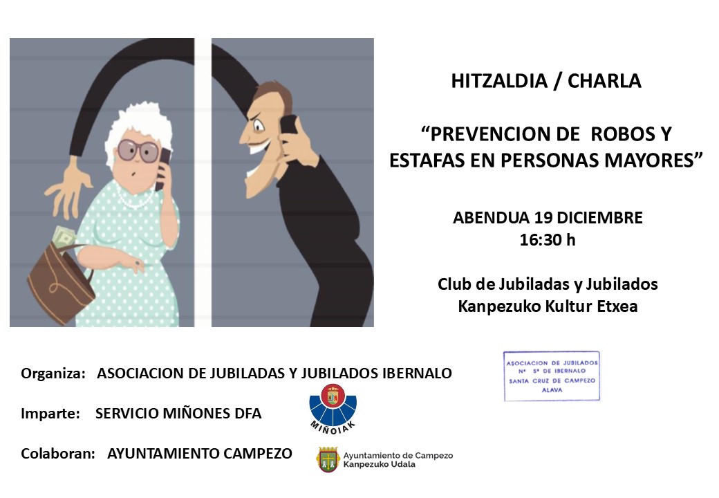 Hitzaldia/Charla: Prevención de robos y estafas en personas mayores (Kanpezuko Kultur Etxea, abenduak 19 de diciembre). Publicado por Mendialdea.Info | | Actualidad, Campezo / Kanpezu, General, Montaña Alavesa, Municipios