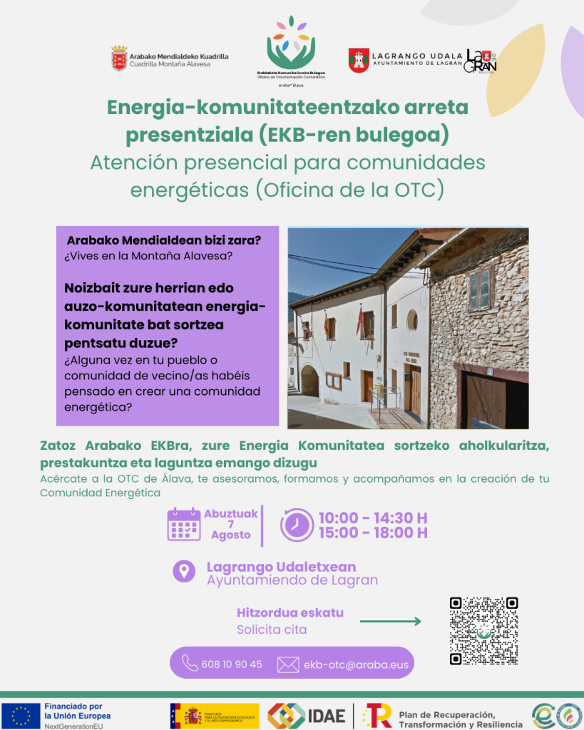 Atención presencial para Comunidades Energéticas. Oficina de la OTC (Lagrán, abuztuak 7 de agosto). Publicado por Mendialdea.Info | | Actualidad, General, Lagrán, Montaña Alavesa, Municipios